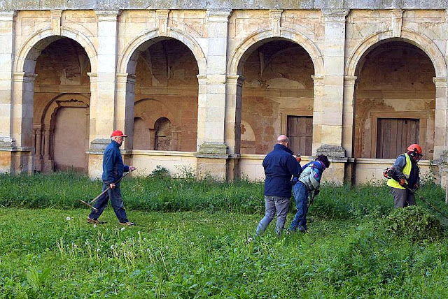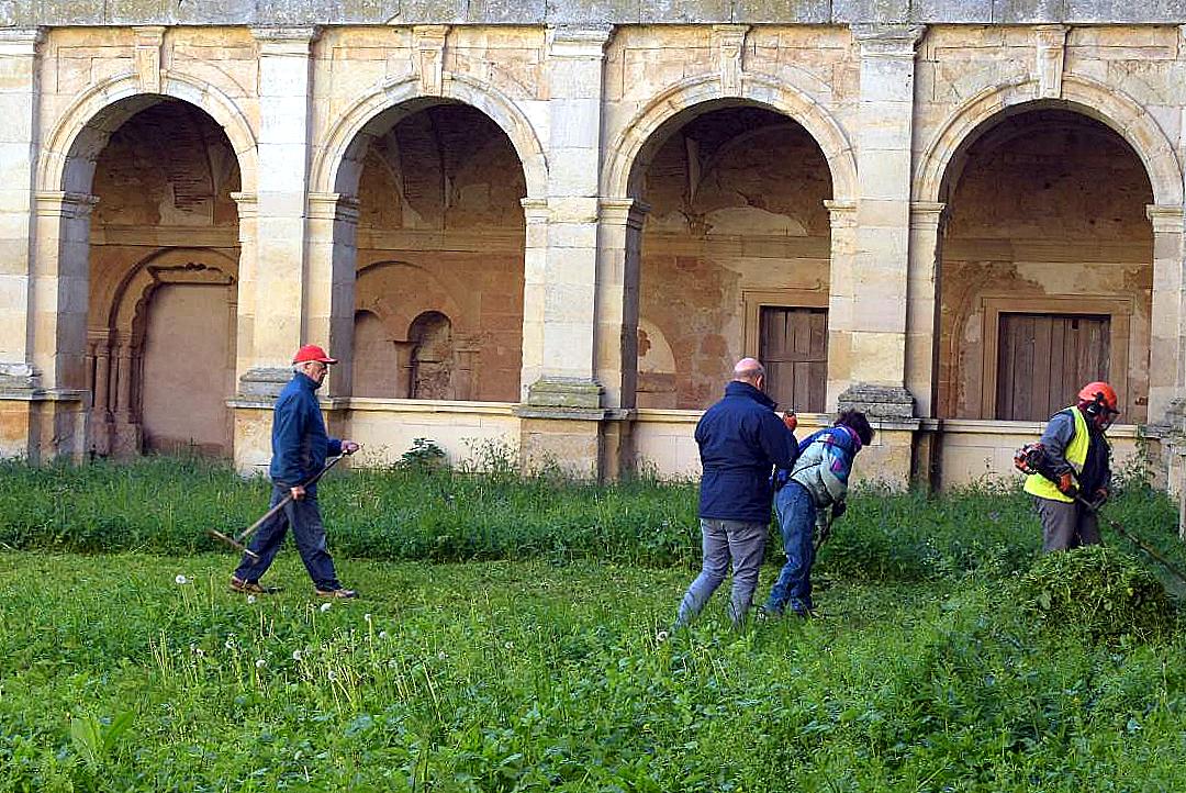 Eliminando maleza en el claustro exterior (J.A. García Villar).
